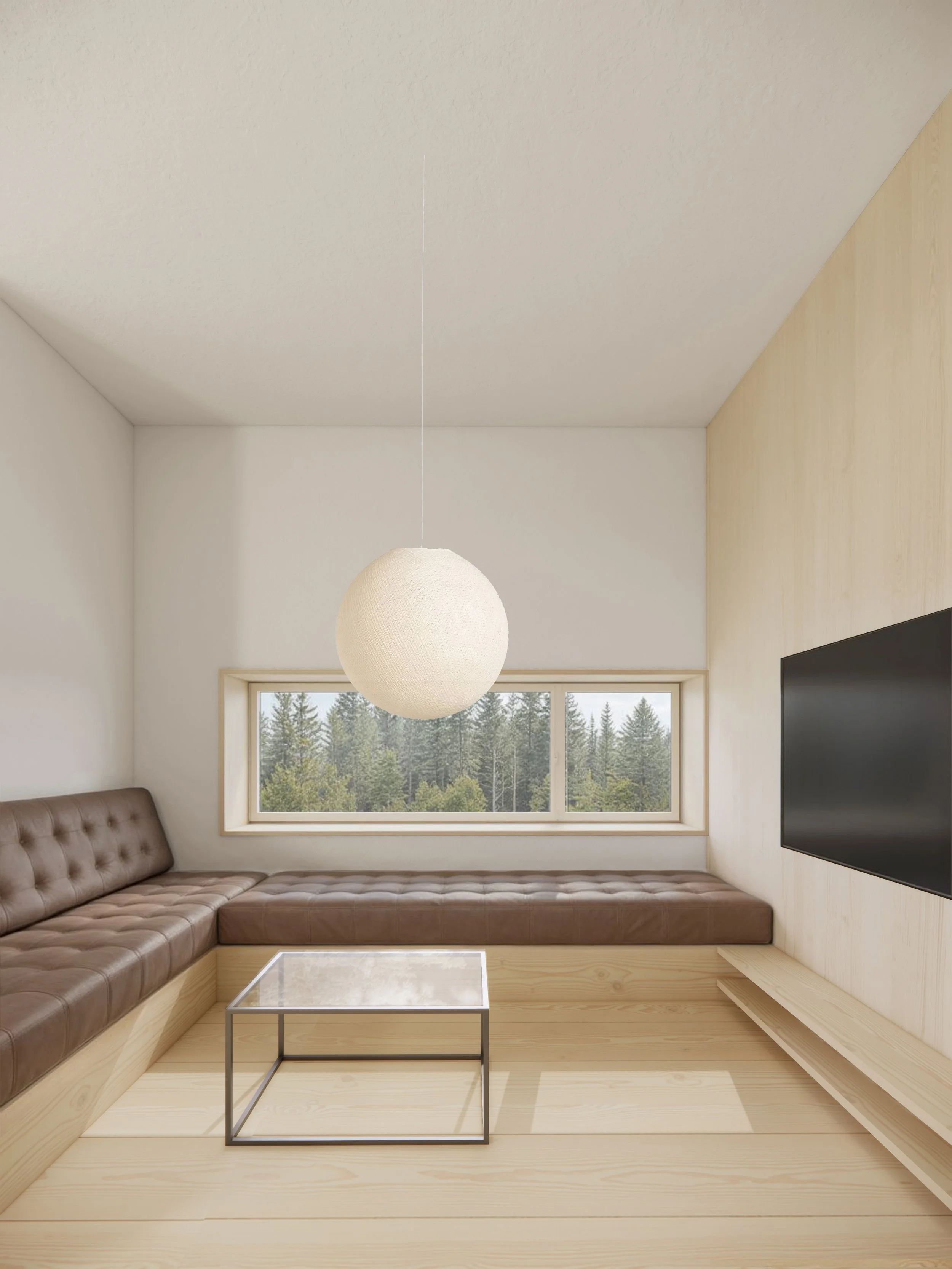 A central architectural element forms the core of the house. Conceived as a sculptural object within the space, it has a structural role, supporting the floors and roof above the main living level, while also integrating a fireplace. The element can be moved around and functions as the heart of the house, organizing movement, structure, and atmosphere.