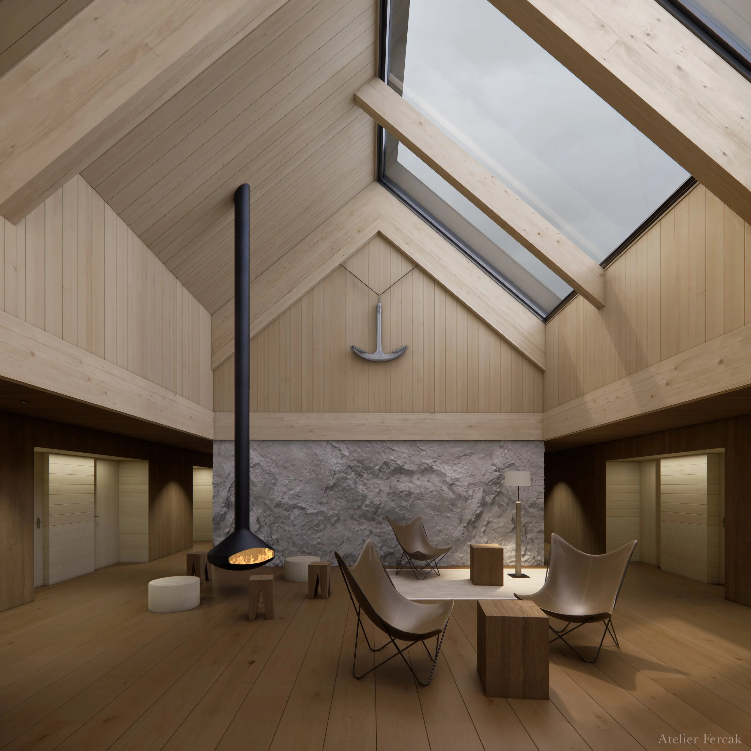 Internally, the extension is conceived as a representative and open space, subtly referencing the history of the island and the client’s field of work. These references are embedded through spatial organization and material expression rather than overt symbolism, contributing to an atmosphere that is both functional and place-specific.